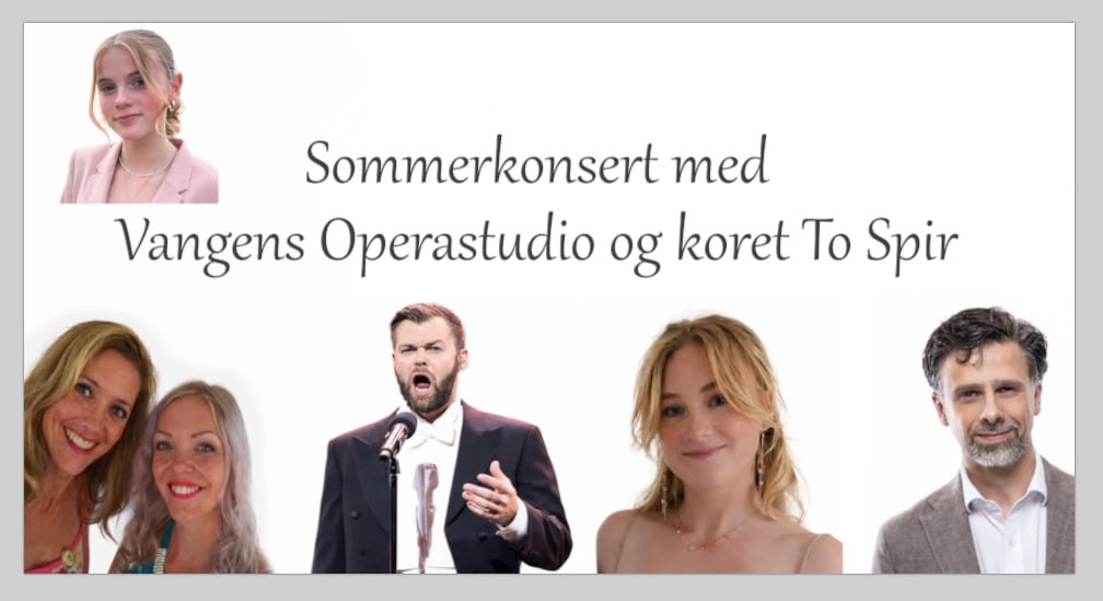 Søndag 14. juni kl.17.00 inviteres det til Villa Lunde for en deilig konsertopplevelse. Både sangere fra Vangens Operastudio og koret To Spir opptrer denne ettermiddagen, begge under ledelse av Arild Bakke. For både sangstudenter og kor blir dette som er storslagen sommeravslutning å regne, og sesongens høydepunkt som det har blitt øvet til i uker og måneder. Publikum får oppleve disse sangerne: Operaingeniørene Anette Øvretveit og Ingvild Berg Martiniussen, tenor-fantom Jostein Fahre, jazzdiva Nelly Smørsgård, talentfulle Matilda Moen Kasin, operadronning Stella Smith Resch og musikalsk altmuligmann Arild Bakke. Villa Lunde, med sin intime og sjarmerende atmosfære, danner den perfekte rammen for en ettermiddag fylt med musikalske godbiter. Dette blir en konsert som kombinerer etablerte talenter og nye stjerner – en opplevelse du ikke vil gå glipp av!