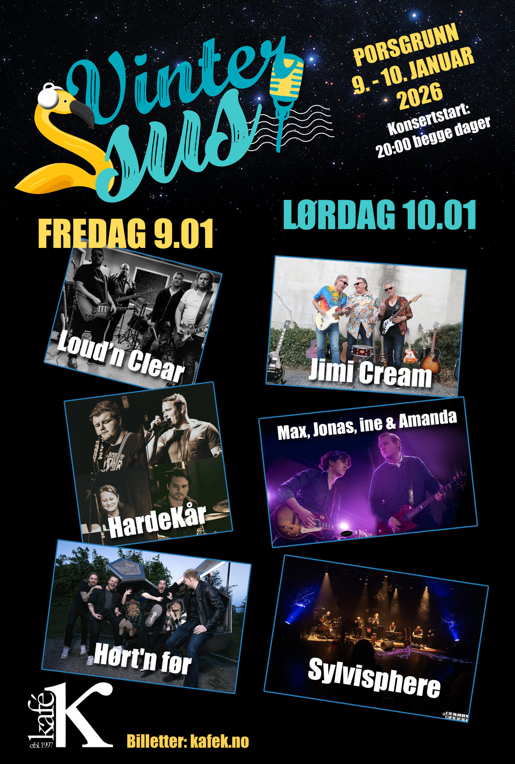 Seks band spiller på Kafe K. Billetten koster kr.250,- per kveld, eller 395,- for begge kveldene.